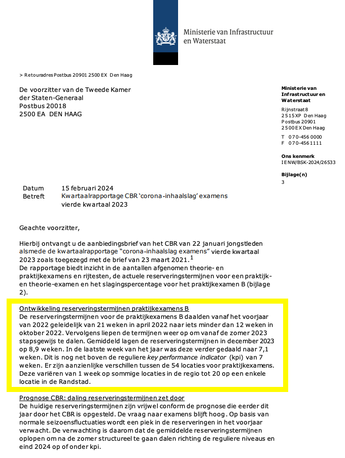 In zowel 2023 als 2024 informeerde de verantwoordelijke minister van Ministerie van Infrastructuur en Waterstaat de Tweede Kamer dat het CBR ernaar streefde om “per jaarultimo” weer aan de kpi te voldoen. Die belofte werd volstrekt niet waargemaakt. De wachttijden bleven oplopen en overschreden structureel de norm.