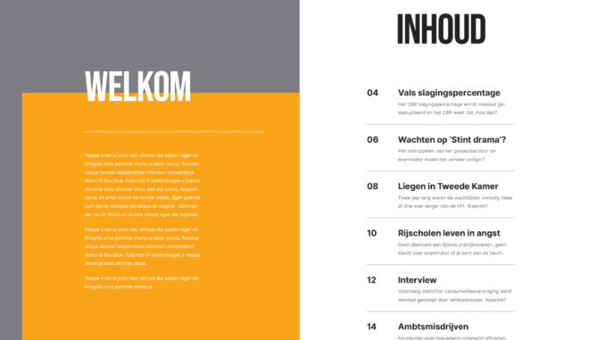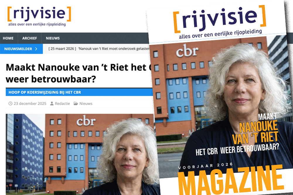 Van het vierentwintig pagina’s tellende glossy magazine Rijvisie, waarin de misstanden die het Centraal Bureau Rijvaardigheid al jarenlang door een heuse angstcultuur in stand weet te houden worden belicht, worden vijfendertig exemplaren naar de leden van de vaste commissie Infrastructuur & Waterstaat van de Tweede Kamer gestuurd. Het eerste proefexemplaar gaat naar de nieuwe algemeen directeur van het CBR: Nanouk Van ’t Riet.